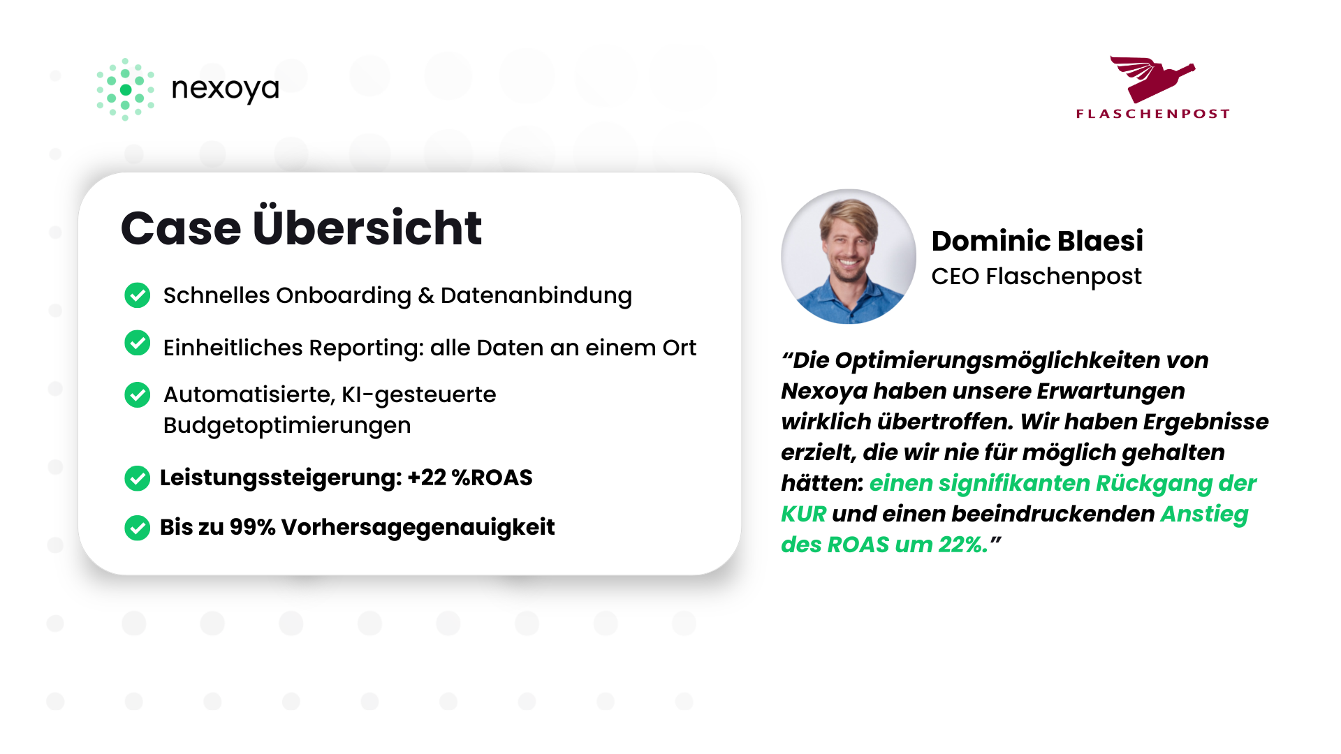 Im März 2024 integrierte Flaschenpost Nexoya für das kanalübergreifende Budgetmanagement von Google, Microsoft, Meta und Criteo. Dank der einfachen Implementierung und des begleiteten Onboardings war die KI-gestützte Portfolio-Optimierung bereits nach drei Wochen produktiv im Einsatz und erreichte innerhalb kurzer Zeit einen ROAS-Uplift von +22% sowie eine nachhaltige Senkung des Kosten-Umsatz-Verhältnisses.